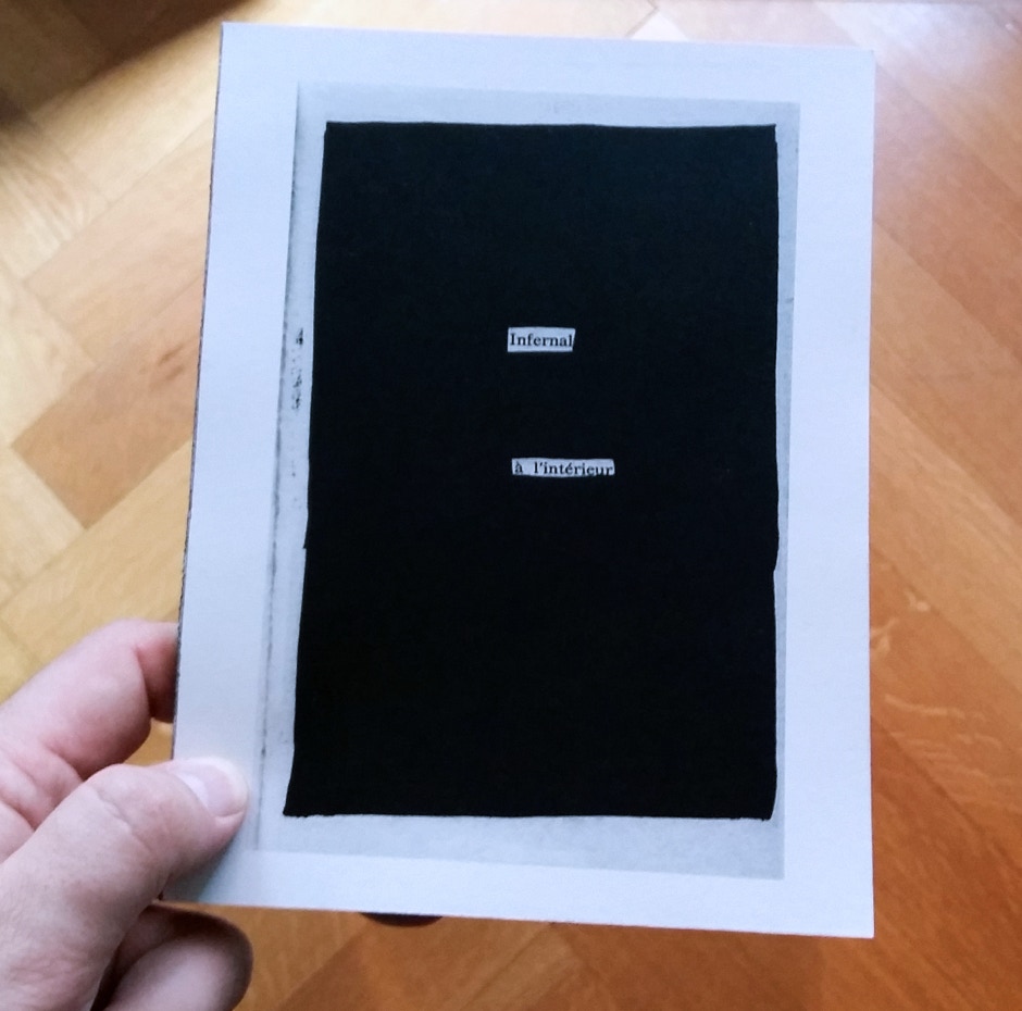 “Infernal à l’intérieur" est une histoire écrite par la réduction de pages complètes d'un roman aléatoire au moyen d’expressions simples. L’auteur et musicien invente une sorte d’écriture automatique et en collage qui tient d’une poésie abstraite (et quasi acoustique) qui évoque un abrégé tragique d’une histoire de famille, de séparation et de mort dans les boucles de temps.