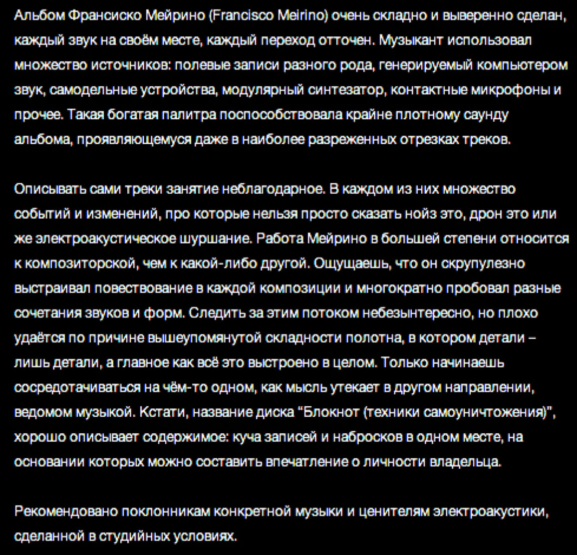 "Questo lavoro nasce inizialmente come un'opera su commissione per l'Audible Festival di Parigi nel 2012. Francisco Meirino è un cesellatore sonoro di stanza a Losanna, dove ho avuto modo di vederlo in azione la bellezza di nove anni fa all'interno del LUFF Festival, in una serata che mi lasciò più dell'amaro in bocca, a causa di un programma a mio modo di vedere poco comunicativo e chiuso in sé stesso. Sbagliai a non approfondire il lavoro di Francisco e ne approfitto ora per parlare del suo nuovo lavoro.