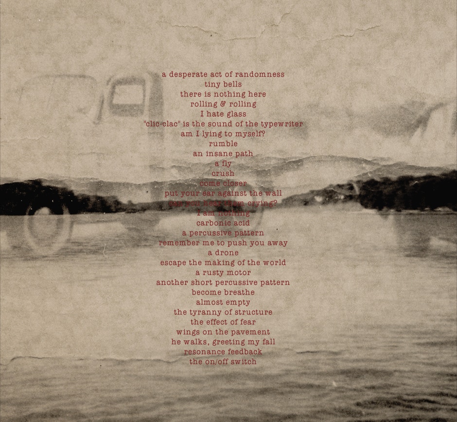 «a desperate act of randomness» the tape recorder’s on/off switch «am I lying to myself ?» «wings on the pavement» «put your ear against the wall» «can you hear them crying ?» «remember me to push you away» «escape the making of the world» another short percussive pattern «he walks, greeting my fall» tiny bells «I hate glass» a rumble crush - carbonic acid «I am nothing» a drone - a rusty motor - a fly - resonance feedback «there is nothing here» the sound of a typewriter «an insane path» «come closer» «almost empty» a percussive pattern «the effect of fear» «become breath» «the tyranny of structure» rolling & rolling.