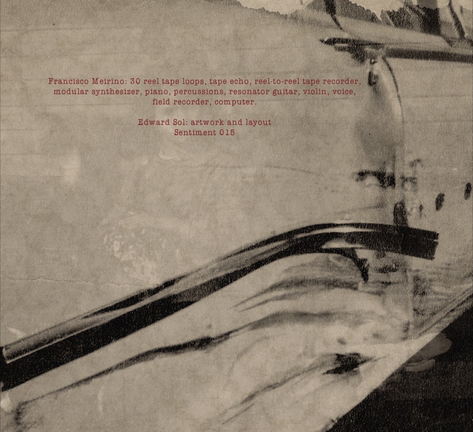 The new release by Switzerland's Francisco Meirino comes in two editions. One is a standard CD, and the other is the CD housed in a wooden box, plus the album on a reel-to-reel machine, plus one of the thirty tape-loops in the production of the music. I got one of those; maybe my recent love for old reel machines didn't go unnoticed? Next to the thirty loops, Meirino uses a lot more, a list of which reads like poetry; a tiny bell, a rumble crus carbonic acid, a drone, a rusty motor etc. There is also a less poetic list, "30 tape loops, tape echo, reel-to-reel tape recorder, modular synthesizer, piano, percussions, resonator guitar, violin, voice, field recorder and computer.