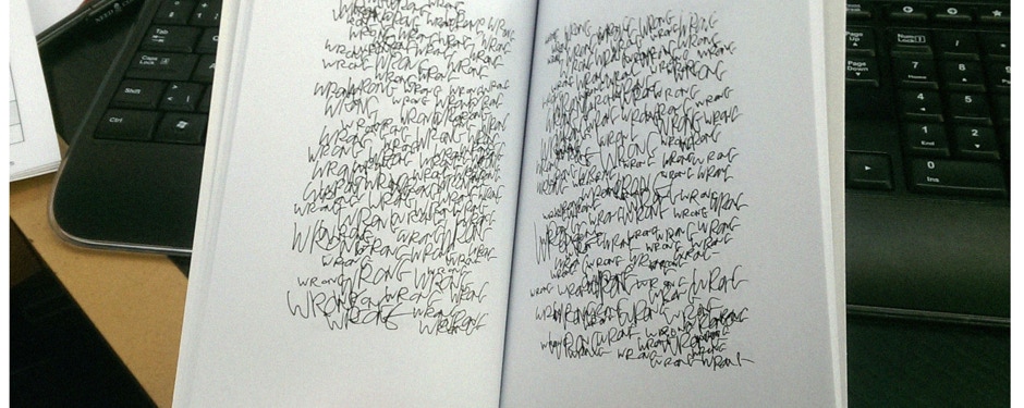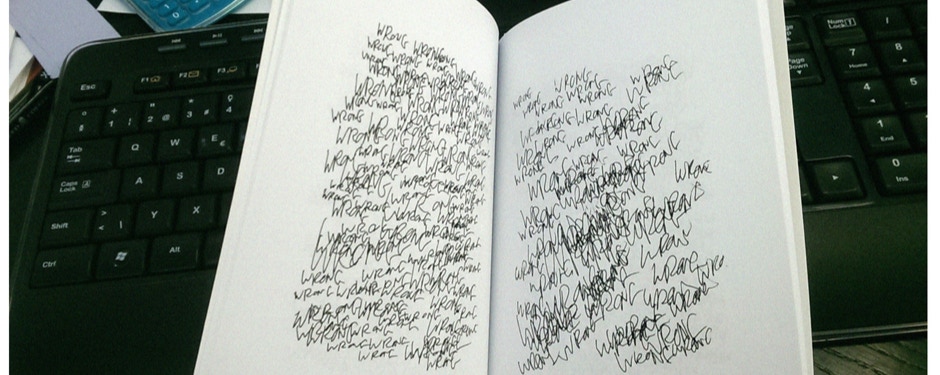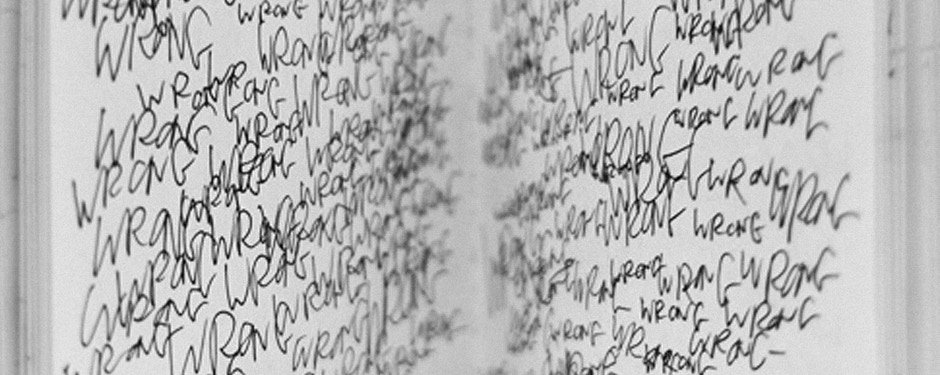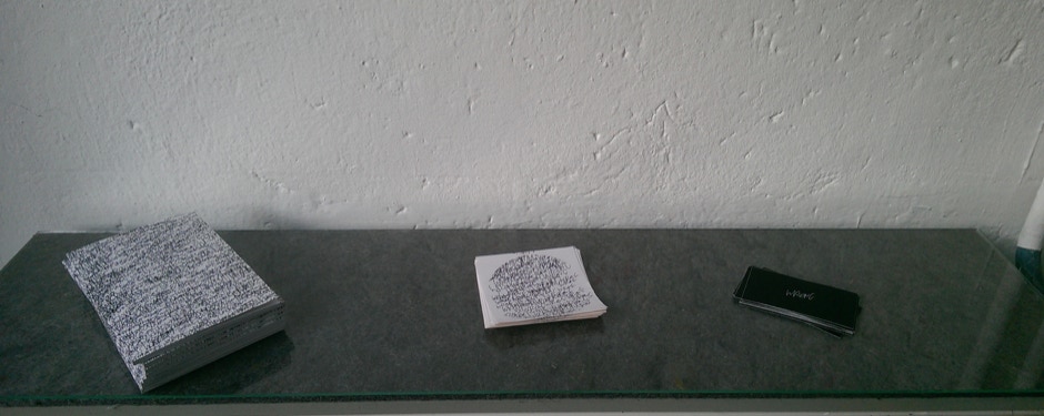 In parallel and in a more confidential way, Francisco Meirino developed a work of drawing and writing. Wrong is the keyword of this installation, repeated nervously in all the media, thus creating a perpetual frequency. Wrong is the fragile cross between the music of Francisco Meirino and his work of drawing-writing. (Press release)